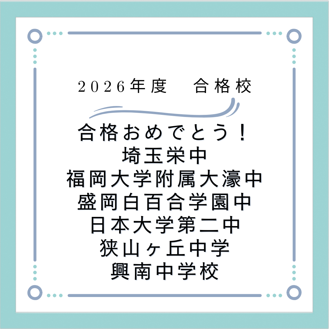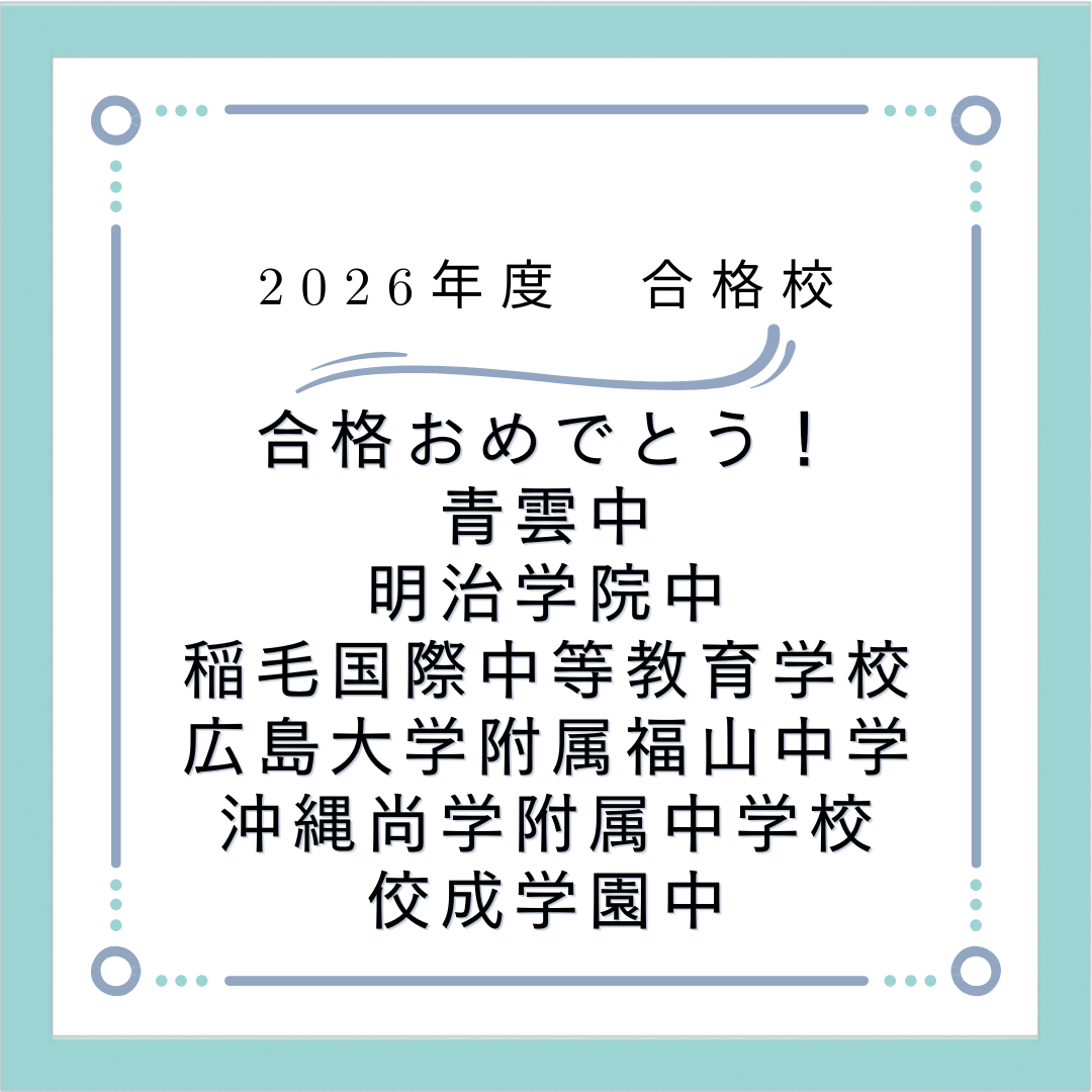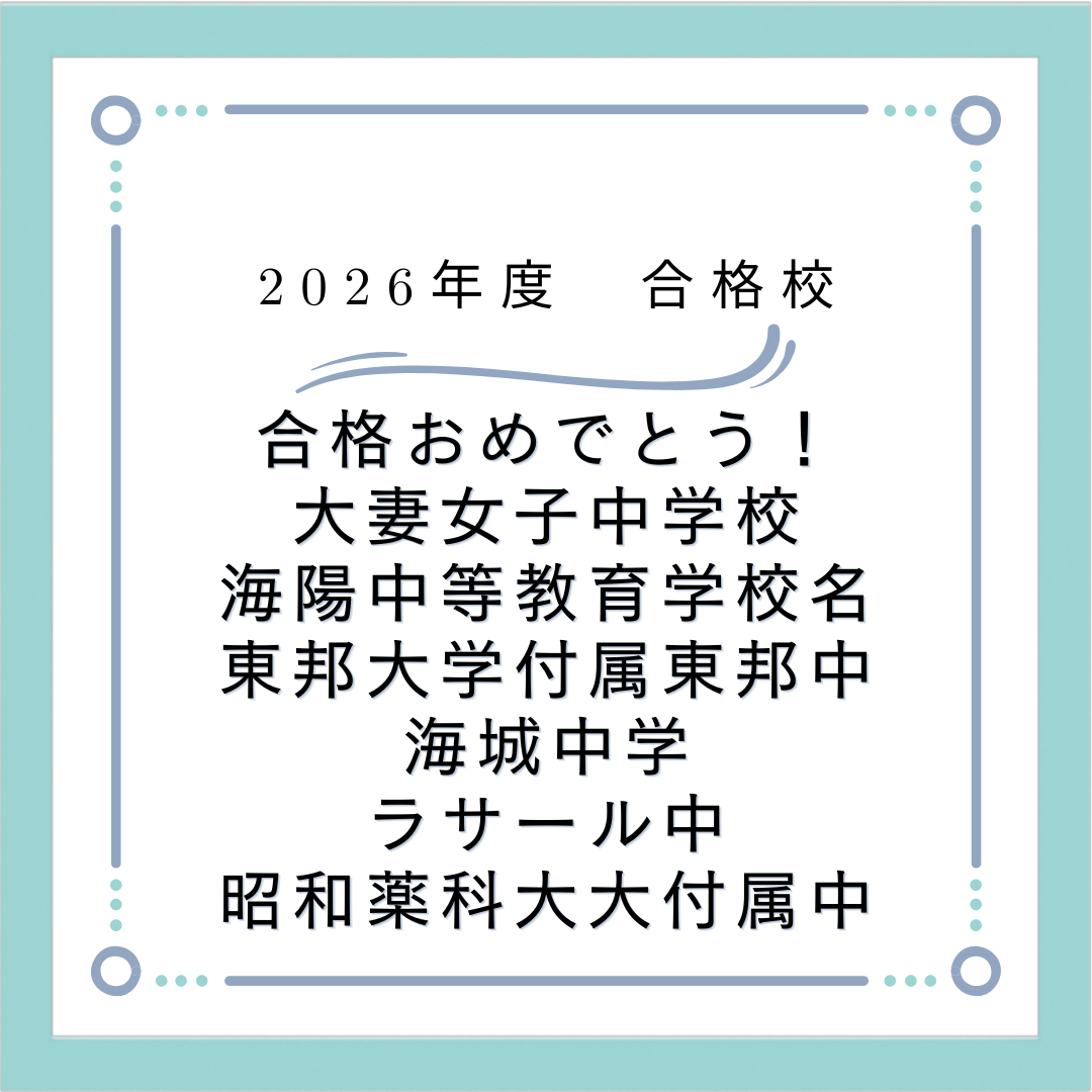 2026年合格学校名 東邦大学付属東邦中,海城中学,ラサール中,佼成学園中,海陽中等教育学校,大妻女子中学校 昭和薬科大大付属中,青雲中,明治学院中,稲毛国際中等教育学校,広島大学附属福山中学 沖縄尚学附属中学校,埼玉栄中,福岡大学附属大濠中,盛岡白百合学園中 日本大学第二中,狭山ヶ丘中学,興南中学校,聖園女学院中学校,聖セシリア女子中学校