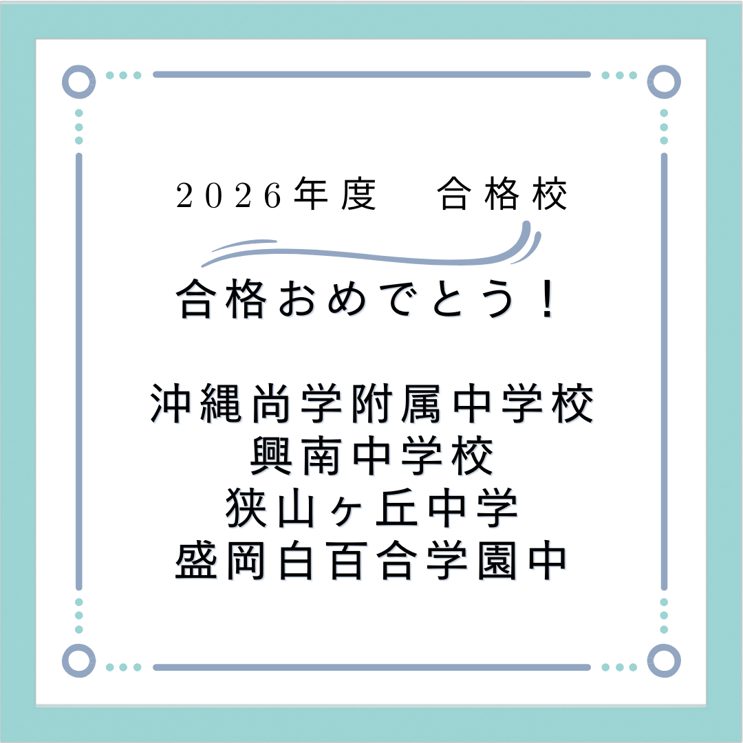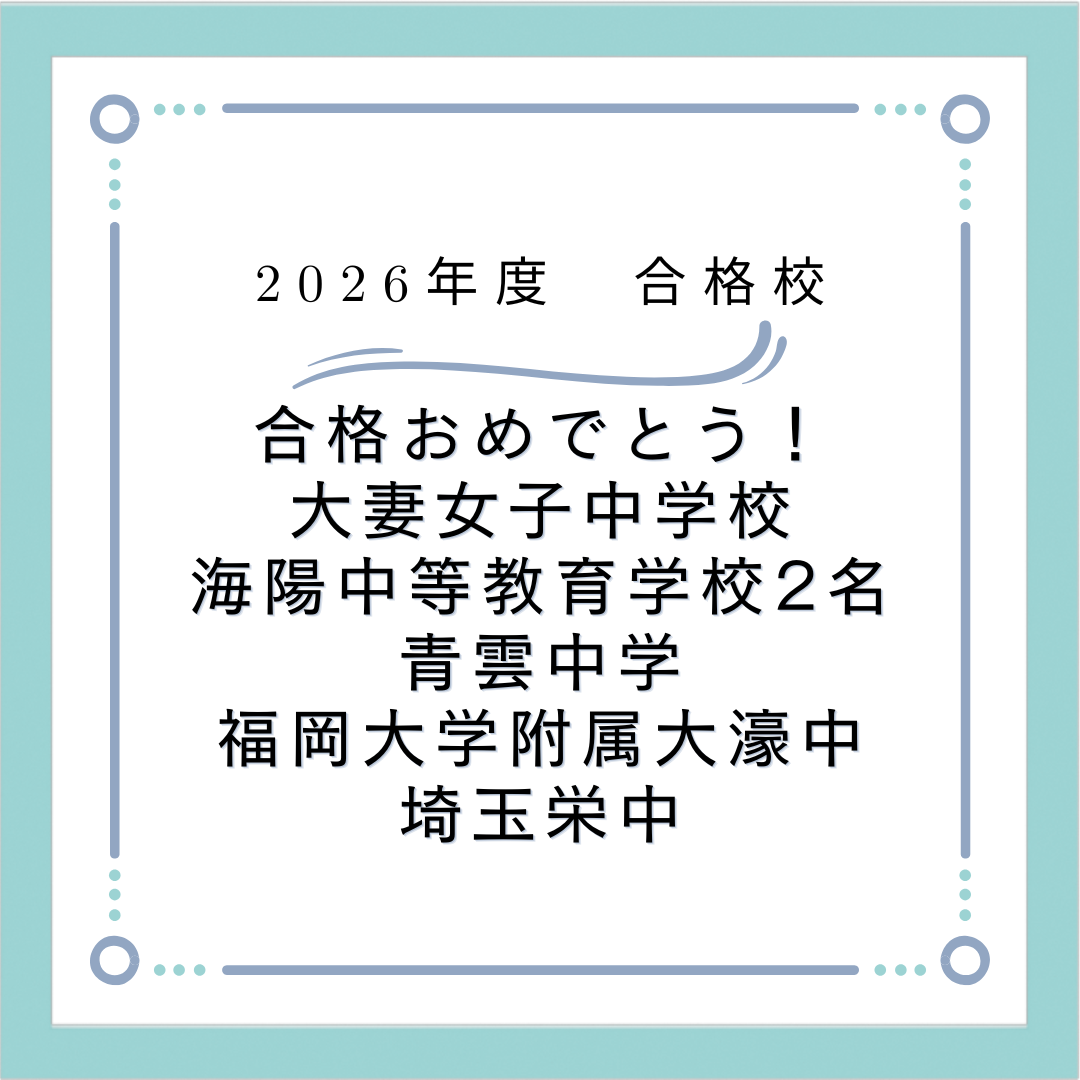 合格おめでとう! 大妻女子中学校(帰国子女枠) 海陽中2名 青雲中 大濠中 埼玉栄中 沖縄尚学中など ※2026年1月20日現在